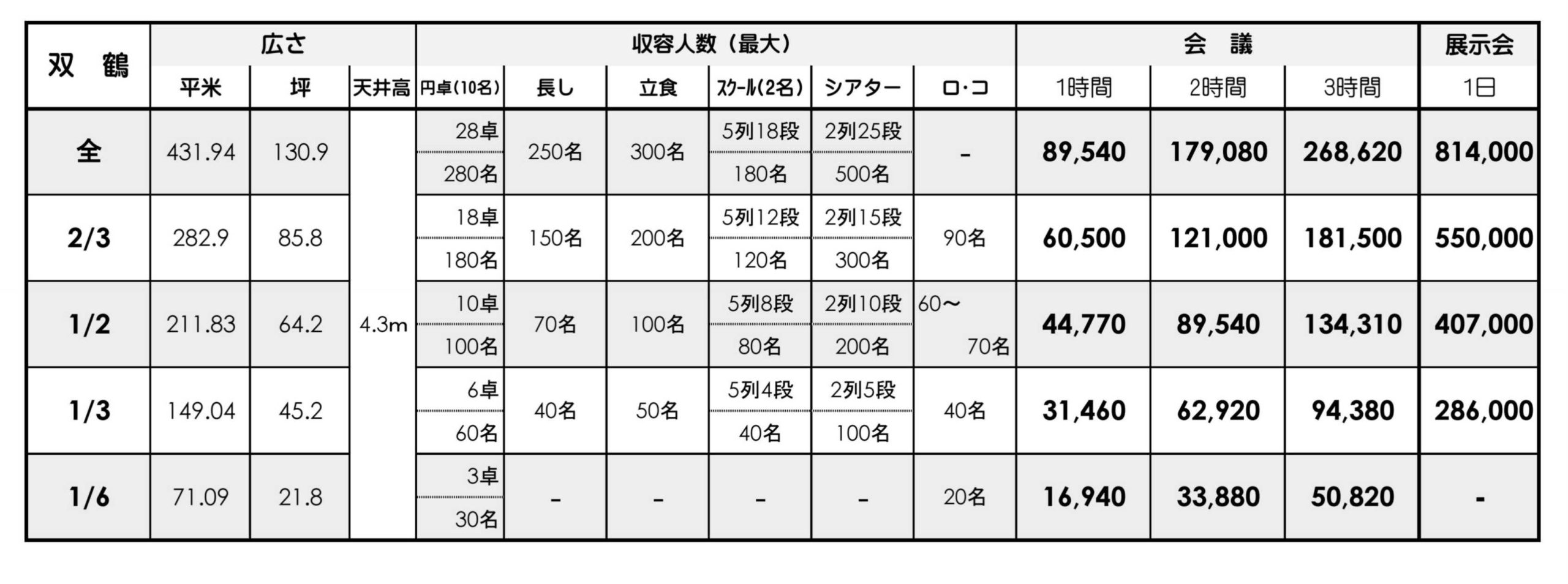 食事代が下記に満たない場合、通常の会場料金とさせて頂きます