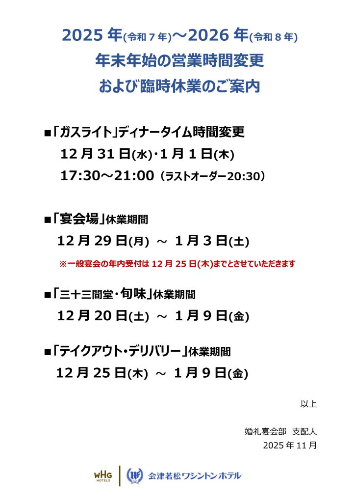 「宴会場およびレストラン】年末年始の営業時間変更および臨時休業の御案内