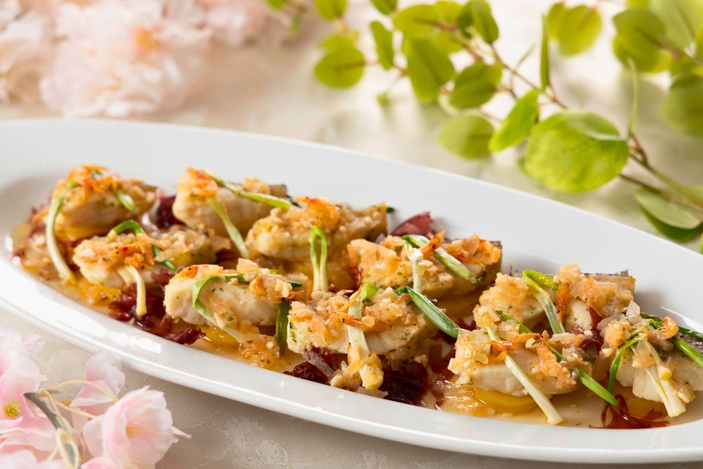 ふっくらと蒸し上げた白身魚に、桜エビの旨味を凝縮した香り豊かなソースを合わせました。桜エビの芳ばしさが春を感じさせてくれます。