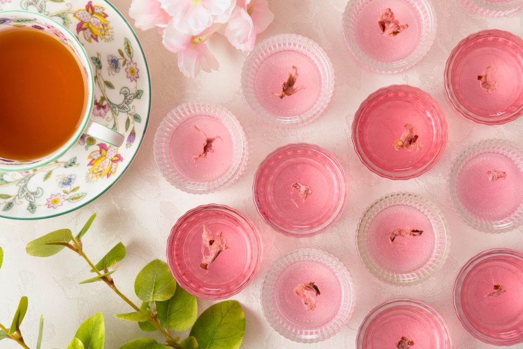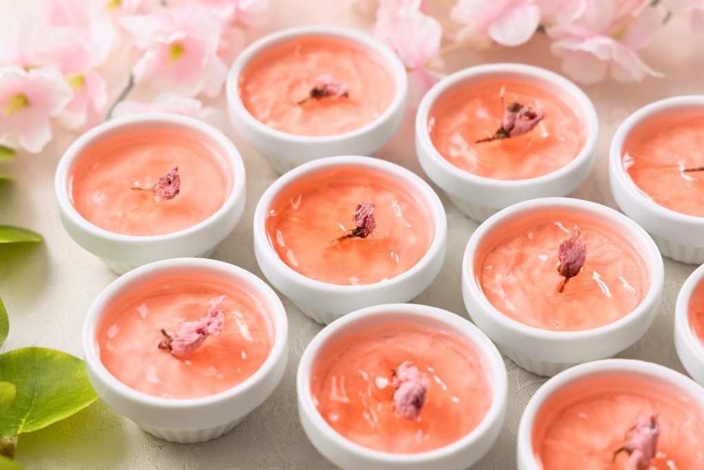 透明感あふれる桜色のゼリーは、見た目にも春らしい一品。すっきり甘さ控えめで、お食事の締めくくりにぴったりです
