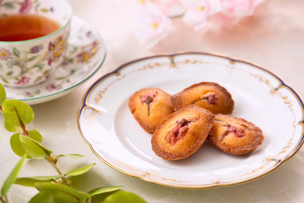 甘さ控えめのマドレーヌに桜の花びらを添えました。サックリとした食感のマドレーヌはシェフ自慢の焼き菓子です。