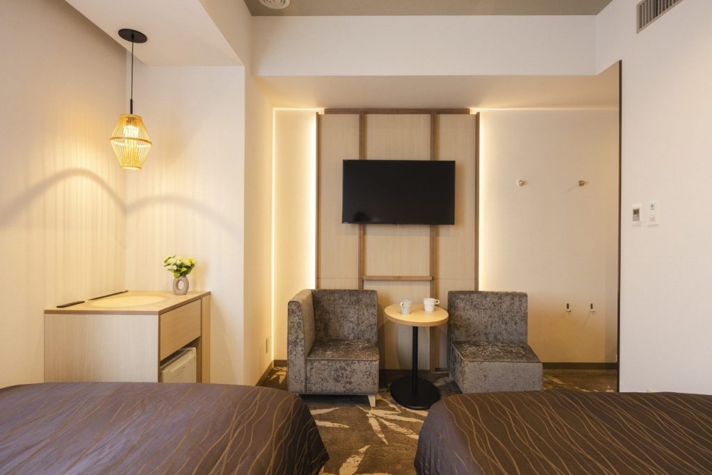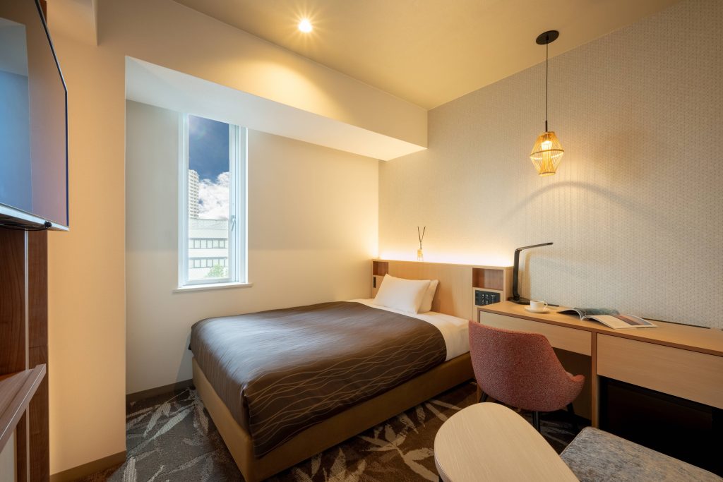 リニューアルした客室は、仙台藩・伊達家が用いた紋章「仙台笹」をモチーフにしたカーペットと、金箔柄のクロスがアクセント。グレイッシュな色合いで統一された木目調の家具と、真鍮色のペンダントライトから零れる光は竹材特有の柔らかな明かりを放ち、温かみのある空間を演出。