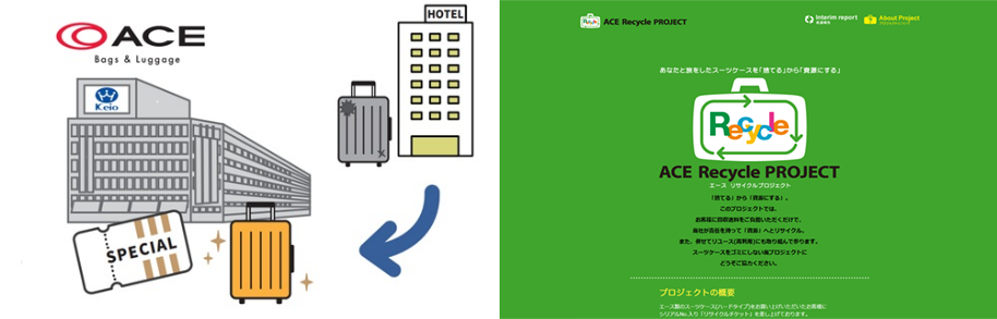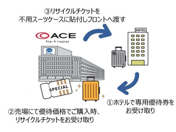 本キャンペーンでは、ご宿泊のお客様が新宿ワシントンホテルまたはホテルグレイスリー新宿にて専用優待券をお受け取りいただき、京王百貨店新宿店4階トラベルバッグ売場「エース」にてスーツケースをご購入された場合、特別ご優待価格でのご提供に加え、不用となったスーツケースを無料で回収できる「リサイクルチケット」をお渡しいたします。リサイクルチケットを不用スーツケースに貼付のうえフロントにお預けいただければ、当ホテルにて無料回収を承ります。