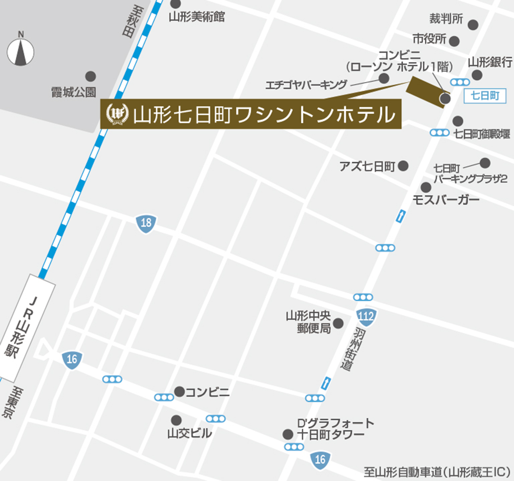 山形七日町ワシントンホテルはJR山形駅より徒歩で約15分、JR山形駅より車で約5分。駐車場は350台収容可能です(契約駐車場、有料)。