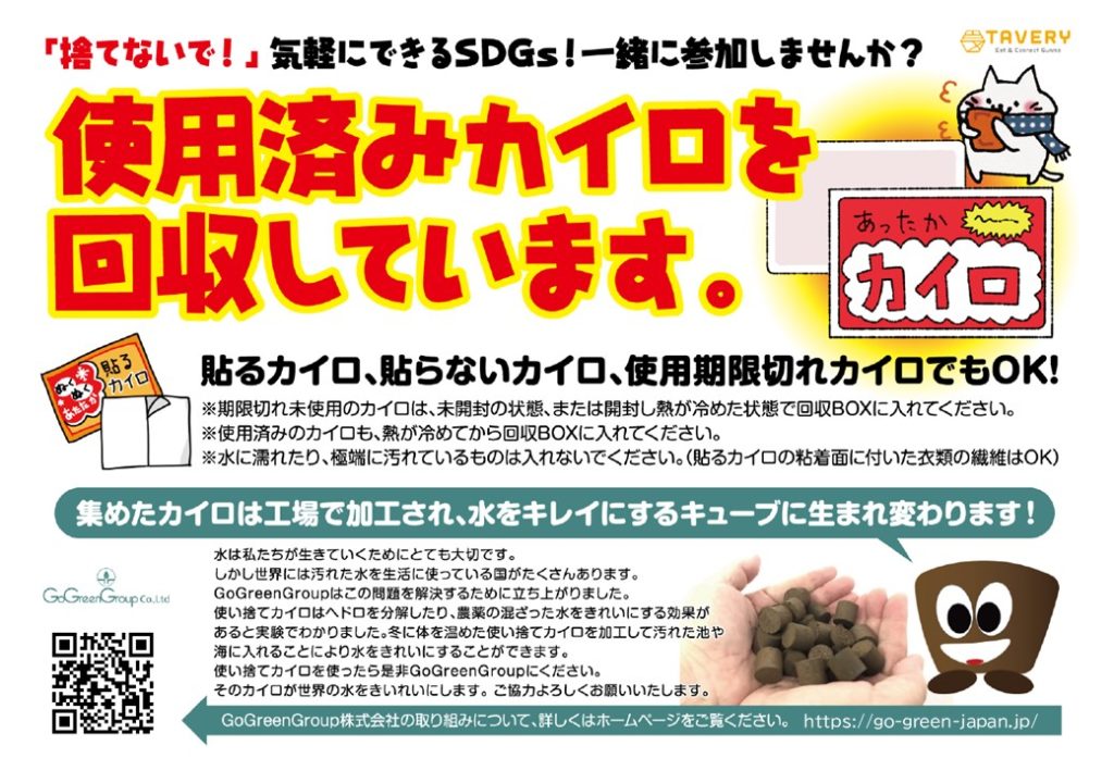 カイロ回収BOXは、2026年3月31日(火)をもちまして終了いたしましたが、多数のお問い合わせをいただいたため、今後はフロントにて回収を承ります。