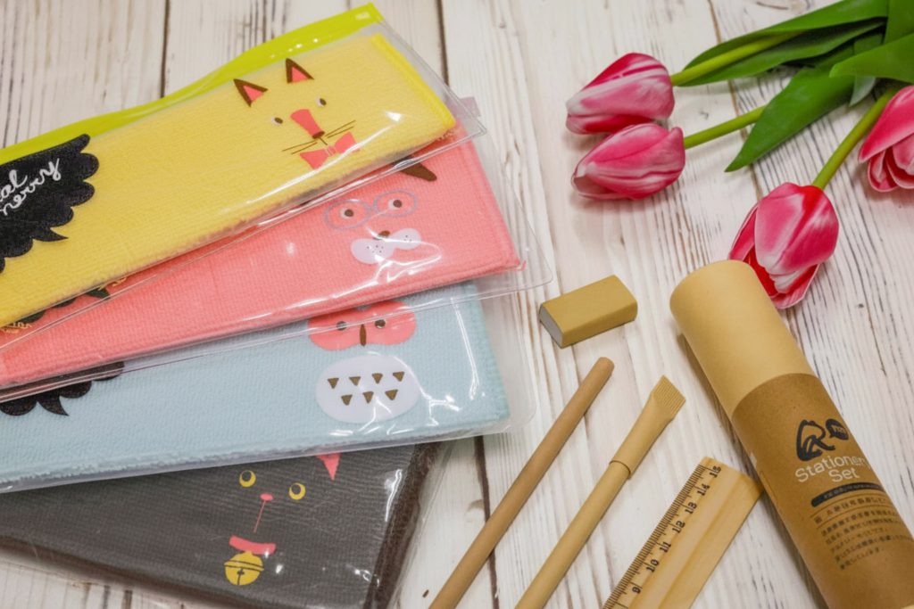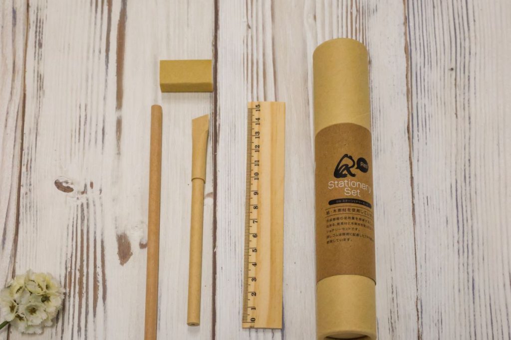 小学生のお子さまには、木と紙を材料としたステーショナリーセット(鉛筆・定規・ボールペン・消しゴム)をプレゼント。