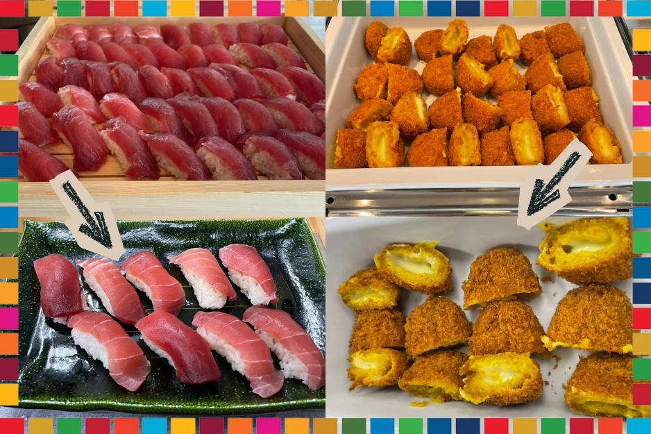 レストランのビュッフェでは閉店時に大量の食材が余り破棄されていました。そこで二つの取り組みを実施しました。