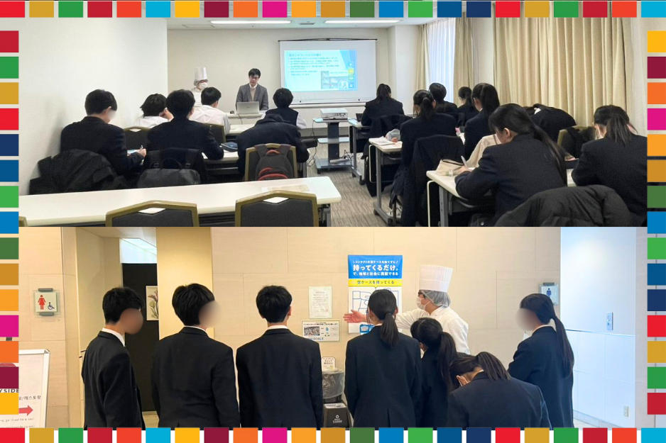 当ホテルでは、校外学習を通じてSDGsの学びを支援しています。座学で当ホテルの取り組みを紹介した後、ユニバーサルルームやレストランなど館内施設を実際にご案内します。