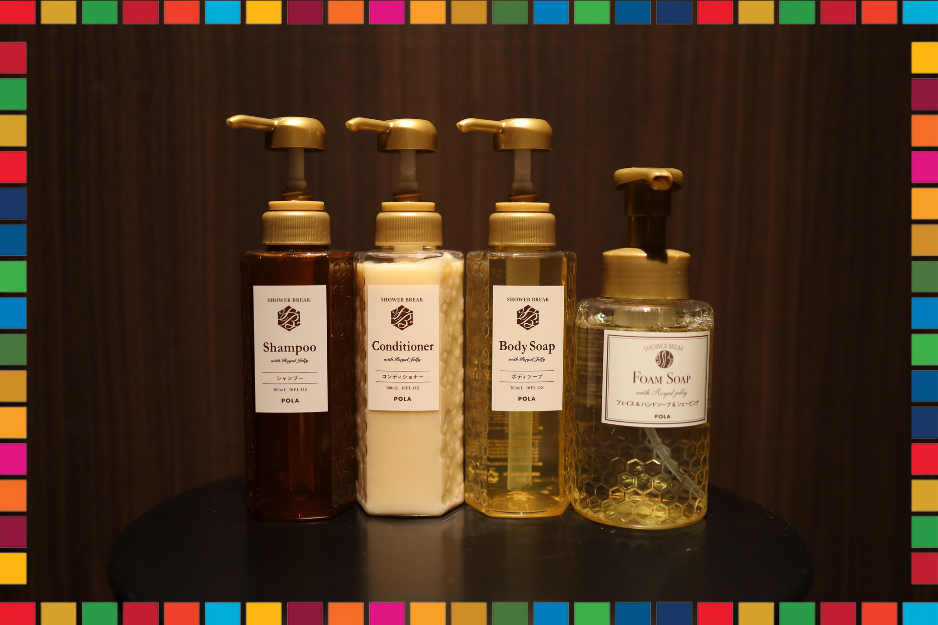 環境に配慮した製品の採用を行っています。客室に配置しているシャンプー・リンスなどのボトルは100%リサイクルされたもの(飲料用のペットボトルなど)を採用しています。