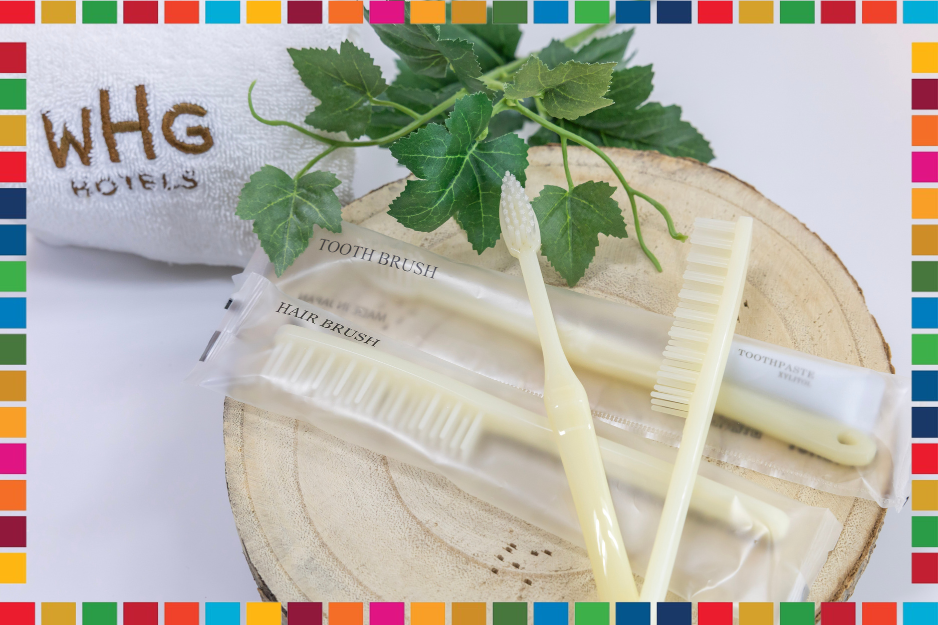 これまでプラスチック製アメニティを採用していましたが、現在は稲のもみ殻を原料とするバイオマス素材に切り替えています。