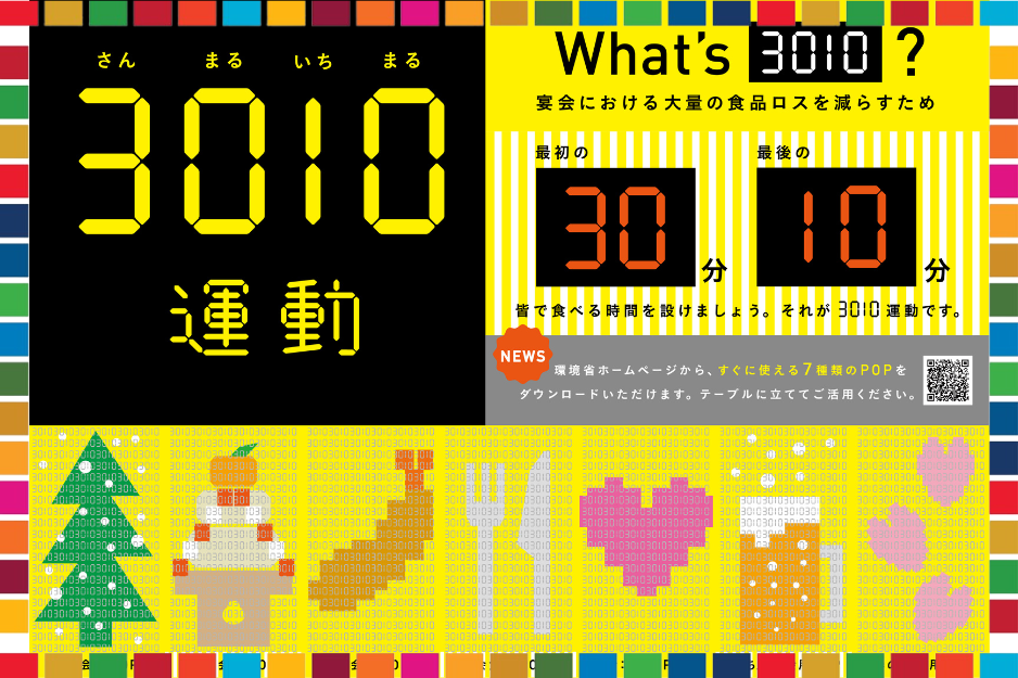 宴会の時に食品ロスを減らす取り組みです。乾杯後の30分間は席を立たず料理を楽しみ、終了前の10分間は再度席に戻り料理を楽しむように呼びかけ、食品ロスの削減を目指しています。
